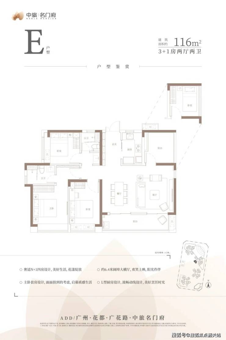 旅名门府建筑采用蝶形布局、点式独栋设计,整体南低北高格局,实现南向采光面最大化,在售户型为80-101㎡全南向三至四房,极致20层高保障每户的通风采光及景观视野。