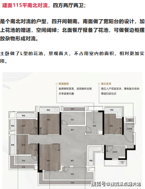 115-116㎡四房两卫(南北对流):4.5 开间朝南,南北对流设计,通风效果好;南向宽阳台 + 北向花池(可改造成餐边柜),空间利用率高;主卧 L 型花池赠送,不占用室内面积,实用性强;使用率超 122%,适合注重居住品质的改善客户。