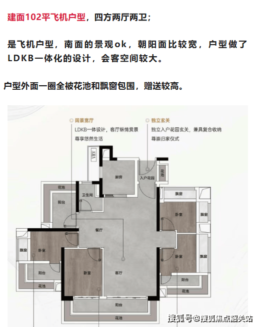 102-105㎡四房两卫:飞机户型 / 四开间朝南,南向面宽约 12.8 米,通风采光极佳;LDKB 一体化设计(客厅、餐厅、厨房、阳台连通),会客空间开阔;入户玄关柜增强收纳,保护隐私;主卧套间带 270° 环幕飘窗,景观视野好;花池全赠送,使用率超 120%,100㎡级实现真四房,适合三代同堂家庭。