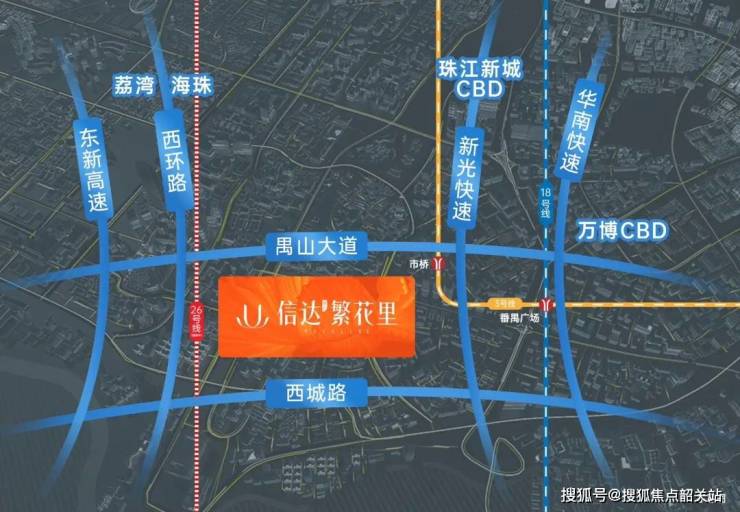 项目坐落于番禺市桥老城核心板块,禺山大道南侧(广州银座酒店南门对面),地处番禺行政、文化、商业核心区域,汇集区政府、政务中心、海关等重要行政部门,享受成熟板块发展红利。交通方面,距离地铁3号线市桥站实测距离约1.3公里,步行约20分钟,或可乘坐社区接驳公交(步行238米至西丽路(西丽广场)公交站)快速抵达地铁站;周边环绕禺山大道、西环路两大主干道,接驳东新高速、新光快速,30分钟内可达万博CBD、珠江新城CBD,8站地铁直达珠江新城,出行便捷高效。根据《广州市番禺区国土空间总体规划(2021—2035年)》,市桥板块将打造为湾区情感枢纽,对标永庆坊升级改造,项目周边覆盖56处历史文化资源,未来区域价值潜力巨大。规划中的地铁26号线临近项目,未来有望成为地铁上盖物业,进一步提升通勤便利性与物业价值。