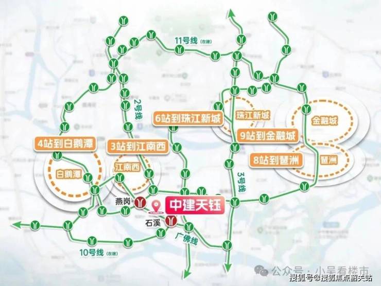 从项目出发,乘坐11号线外环去琶洲只需要8个站,耗时44分钟左右;去珠江新城坐广佛线到沥滘换乘3号线,全程仅6个站,耗时35分钟左右。