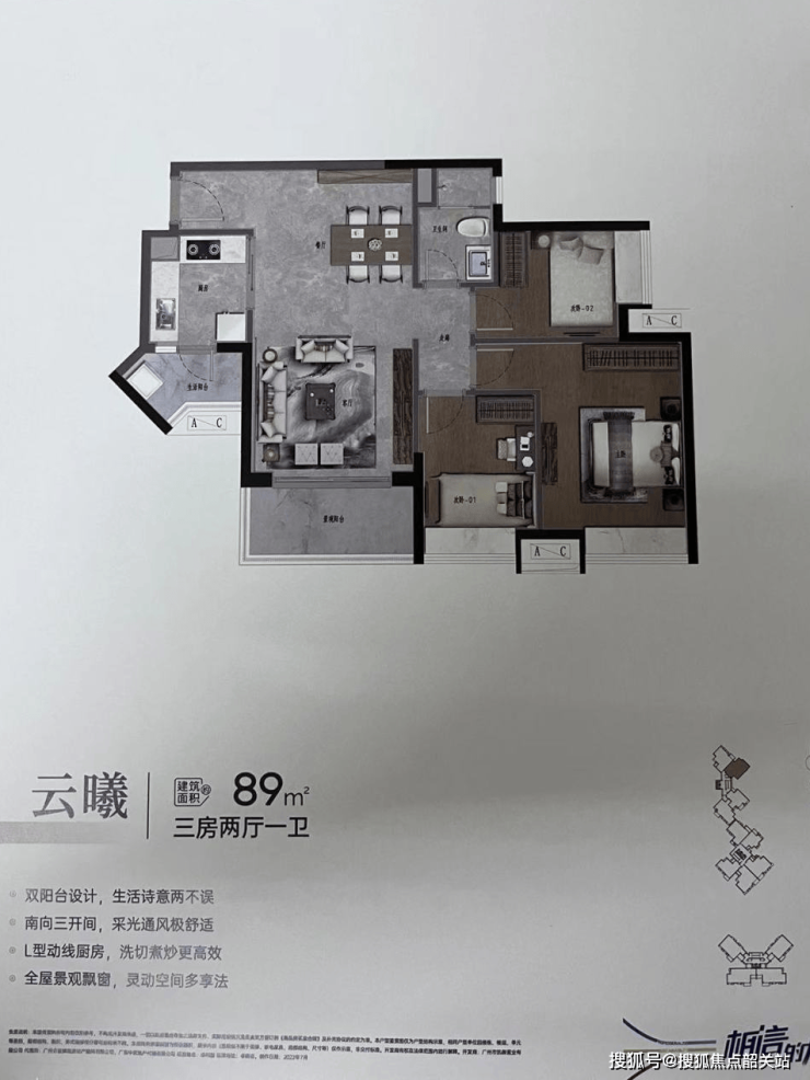 89㎡三房 ,三开间朝南,客厅宽敞双阳台设计,这个户型是整个项目中比较好的,预计会比较抢手。