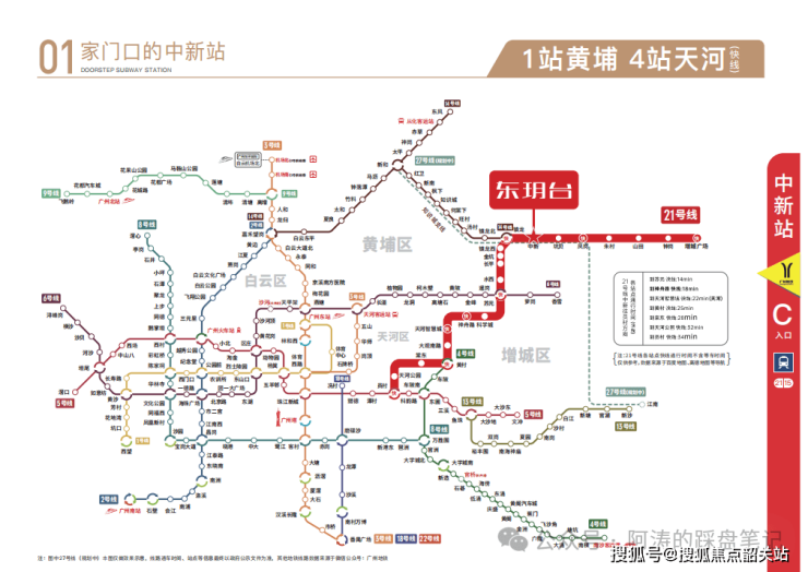 项目构建了轨道交通与地面路网全覆盖的全维度高效交通体系,可实现广州中心城区与粤港澳大湾区核心城市的快速通达。轨道交通方面,项目紧邻地铁 21 号线中新站,该线路为广州东部核心快线,设置快慢车运营模式,快线 3 站即可直达天河员村,换乘地铁 5 号线可快速抵达珠江新城 CBD,早高峰通勤可实现 1 小时内通达广州中心城区核心商圈。项目 1 站即可到达镇龙 TOD 枢纽,该枢纽为广州东部核心交通换乘中心,可换乘穗莞深城际铁路,快速通达深圳宝安机场、广州白云机场两大国际航空枢纽,实现粤港澳大湾区核心城市的 1 小时通勤。自驾路网方面,项目 5 公里范围内可接驳广河高速、花莞高速、从莞深高速、济广高速等 8 条高速公路,通过广汕公路可快速连接黄埔科学城、天河智慧城,30 分钟车程可达黄埔科学城核心区,40 分钟车程可达天河珠江新城,构建了全方位、多维度的高效出行网络。