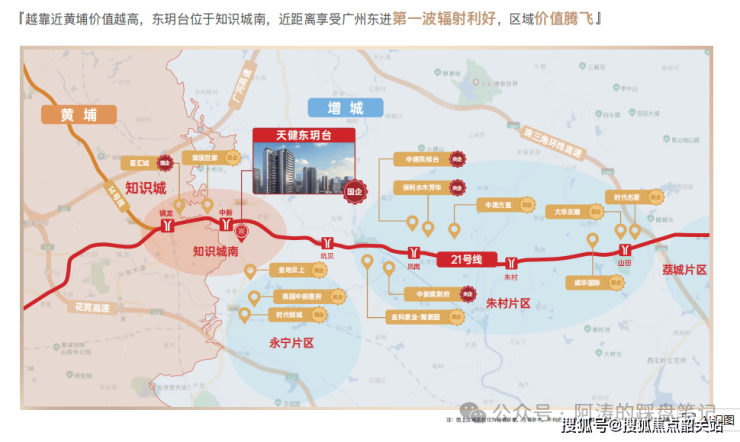 本项目坐落于广州市增城区中新镇核心板块,处于广州东进战略核心发展轴上,同时占位中新知识城南部门户区位,是广州东部产业与居住融合的核心宜居板块。中新镇作为广州东进战略的重要节点,串联起黄埔科学城、中新知识城、增城开发区三大千亿级产业集群,三大产业集群已累计入驻超 3000 家高新技术企业,其中包含超 100 家世界 500 强企业,持续导入高素质就业人口,为区域居住价值提供长期支撑。项目所处片区同时承接珠江新城、天河智慧城、黄埔科学城的居住外溢需求,是广州东部通勤圈核心宜居板块,依托广州东进战略的持续推进,区域城市界面与配套能级将持续提升,具备长期的价值增长空间。
