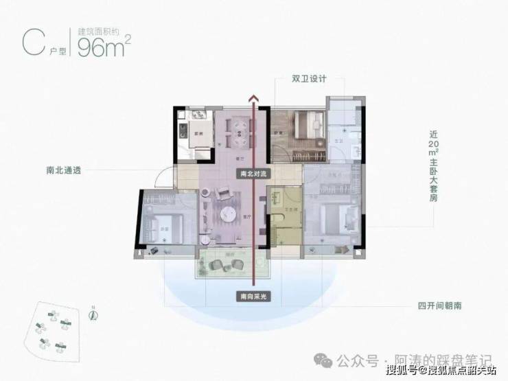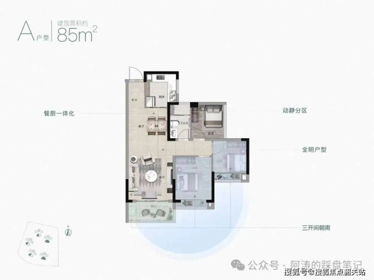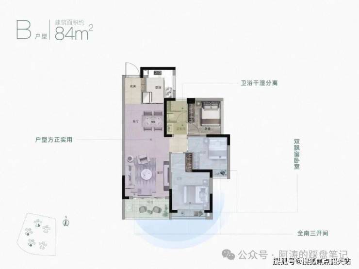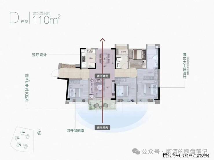 项目主力在售建面约 84-110㎡三至四房全周期户型产品,户型实用率达到 75%-85%,覆盖了从刚需首置到刚改型家庭的全维度居住需求。项目全系户型均采用全南向设计,户户朝南,保障了室内充足的采光与良好的通风效果,实现了明厨明卫、全明空间的户型格局。其中建面约 84-85㎡三房两厅一卫户型,为刚需首置核心产品,采用三开间朝南设计,南向整体面宽达到约 9.6 米,搭配南向景观阳台,最大化保障了室内采光面,同时通过科学的空间布局,实现了小面积大空间的使用效果,可满足新婚夫妇、年轻三口之家的居住需求。建面约 96㎡三房两厅两卫户型,采用 LDK 客餐厨一体化设计,打造了开放式家庭互动核心空间,主卧采用套房设计,配备独立卫浴与衣帽间,兼顾了实用性与私密性,适配成长型家庭的居住需求。建面约 110㎡四房两厅两卫户型,为项目楼王产品,采用四开间朝南设计,南向整体面宽达到约 12.4 米,搭配约 6.8 米阔景阳台,同时主卧采用端厅套房设计,可满足多孩家庭、三代同堂家庭的终极居住需求。
