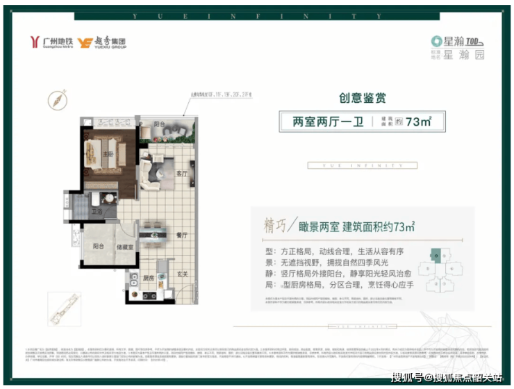 建面约73平米的江景两室户型,是目前项目最受欢迎的户型之一,特别适合刚需客群。这个户型设计亮点多多: