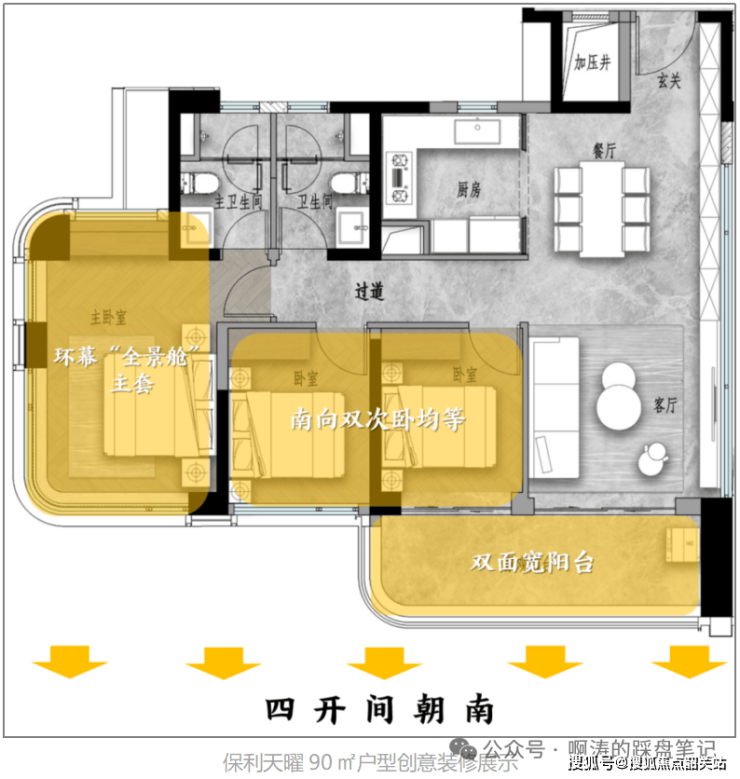 该户型层高达到 3.1 米,相较于传统户型拥有更充裕的垂直空间,室内空间感更为开阔,不会产生压抑感。近六米的双面宽阳台连接客厅与次卧,拓展了室内的活动空间,成为家庭休闲、观景的第二公共区域。南向双次卧面积均衡,保障居住舒适度,还可根据需求改造为超大宽厅,适配多样化的生活场景。