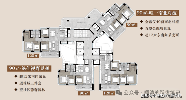建面约 90 平方米的户型是项目的特色产品之一,在户型设计上突破传统局限,做到了三房两卫的合理布局。户型设计预留充足的视觉通廊,保证室内良好的通风与采光效果,部分户型可直望珠江新城城市景观与社区中央园林景观,超百米的楼间距让视野更为开阔,尽享城市与园林双重景观。