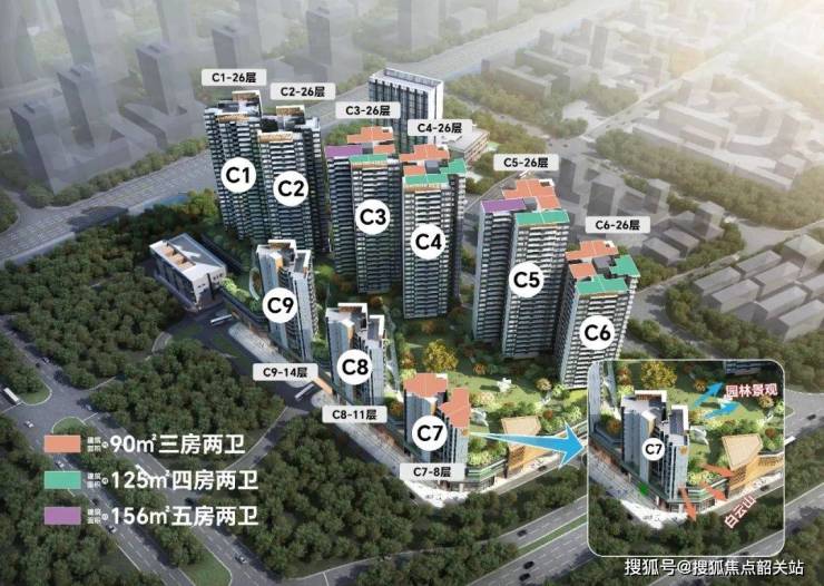 越秀公交·天悦云山府推出的户型面积涵盖了从90平方米到156平方米的三至五房选择,适合不同需求的家庭。当前主要在售的是C2栋和C7栋,其中C2栋为26层高,提供90平方米和125平方米两种户型;而C7栋则为8层高的低密度洋房,采用两梯四户设计。特别值得一提的是,部分户型可以享受一线的白云山景,提供了极佳的居住体验。
