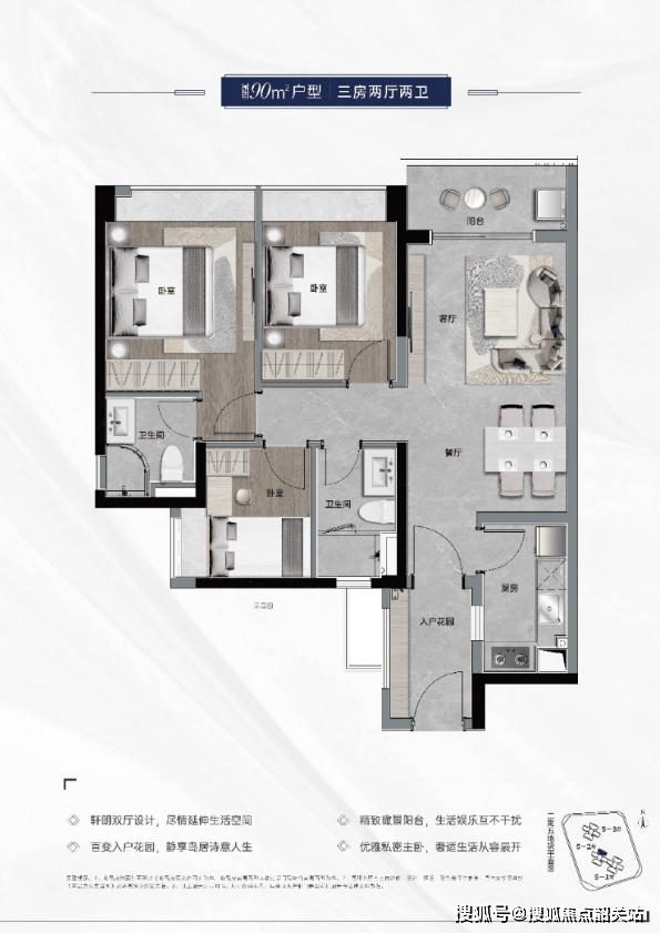 90平方米3室2厅2卫:紧凑实用,适合小家庭。