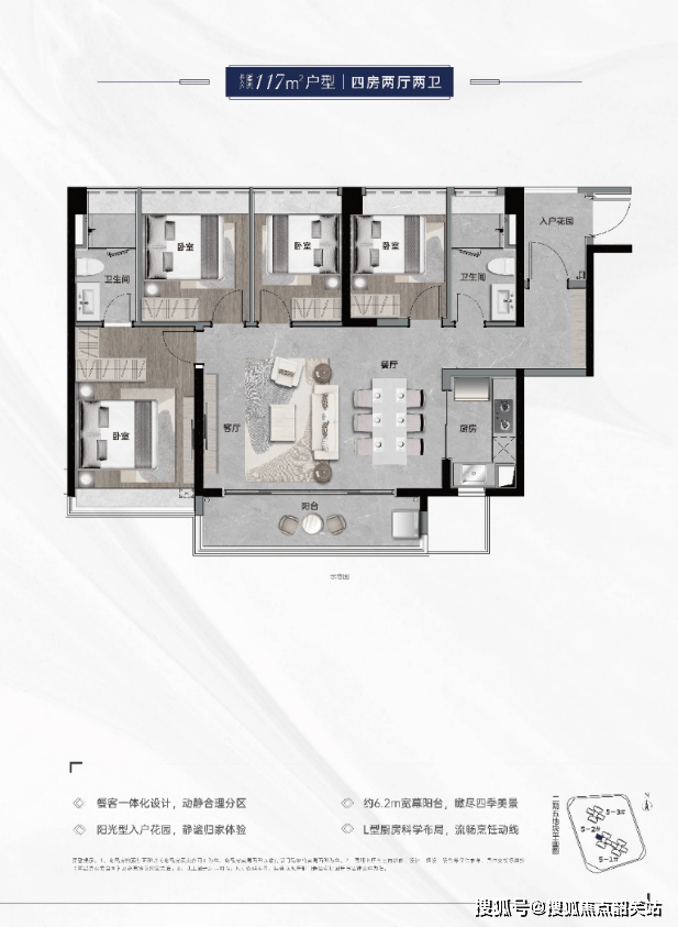 115平方米4室2厅2卫:超大阳台,南北采光通透。
