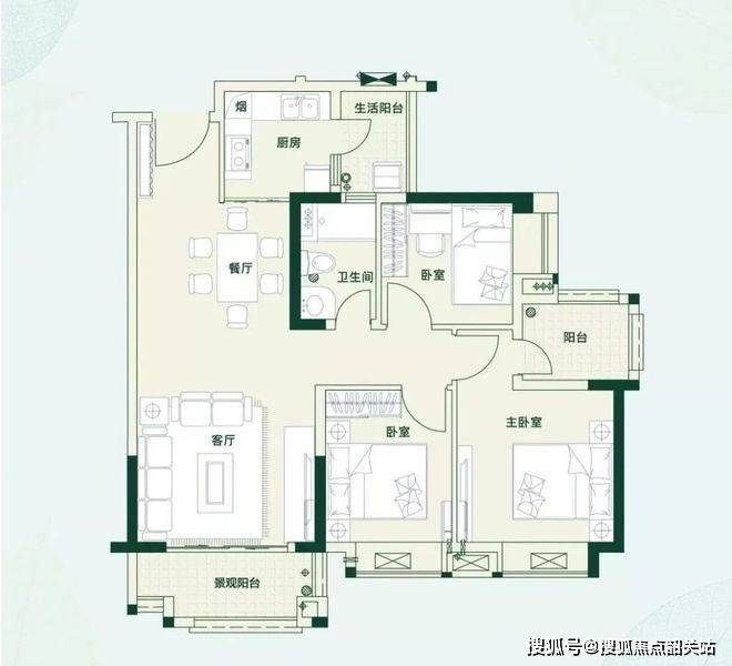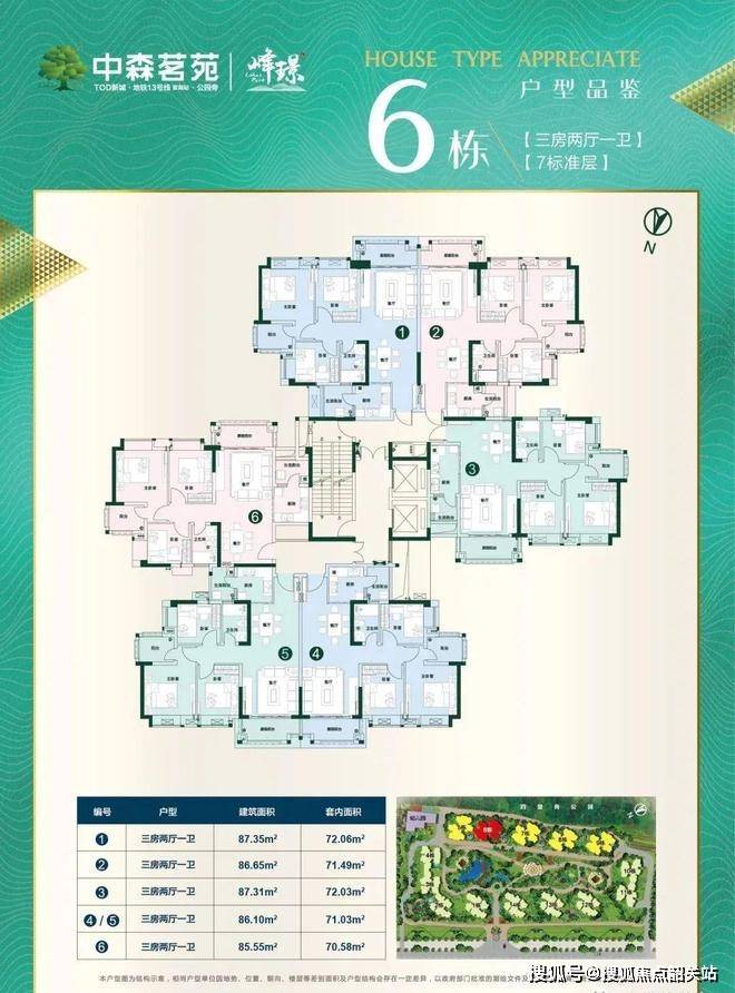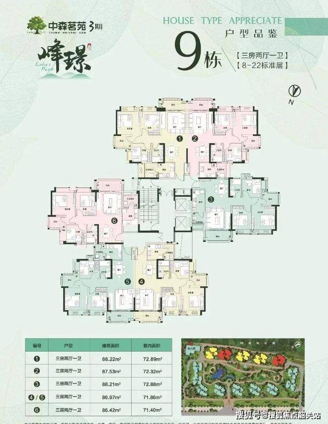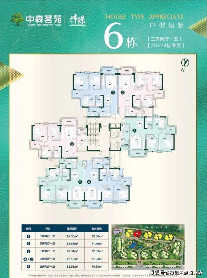 中森茗苑的建筑设计注重空间利用和居住舒适度,三期产品采用两梯六户或两梯五户设计,南望市政公园,北望活水园林,视野开阔。86-88平方米的三房户型,使用率接近9成,户型方正实用,南北通透,采光良好,为居民提供了宽敞明亮的生活空间。项目户型图