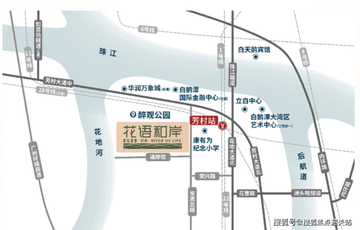 项目距地铁1号线芳村站约800米,步行可达。未来更将接入广州地铁11号线(已开通)、22号线(建设中)及28号线(规划中),形成“四线交汇”的超级枢纽,实现0换乘直达广州南站、广州站乃至白云机场。地面交通同样便捷:花地大道与芳村大道双主干道交汇,周边3公里范围内覆盖珠江隧道、洲头咀隧道、如意坊隧道(建设中)及东沙隧道(建设中),高效连接内环路与环城高速。此外,约1公里处设有芳村码头,可搭乘水上巴士S2线至广州塔、S6线至海珠滨江,多元出行方式构筑半小时珠江商圈生活圈。