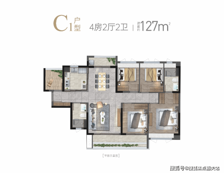 建面约129㎡四房两卫(注:原文提及127㎡与129㎡,此处统一按大区间描述,实际以现场为准,文中素材主要描述为127㎡,此处修正为素材中的127㎡进行详细描述,同时保留129㎡的提及以覆盖可能的变体):主打南北对流,双阳台设计实现了休闲与晾晒的功能分区。U型厨房操作动线合理,能同时容纳多人备餐,充满了生活的烟火气。四个房间分布均匀,无面积浪费。既能满足二胎家庭的居住需求,也能预留一间作为书房或客房,实用性极强。总价在374万至381万之间,剩余房源可选楼层不多,需抓紧把握。