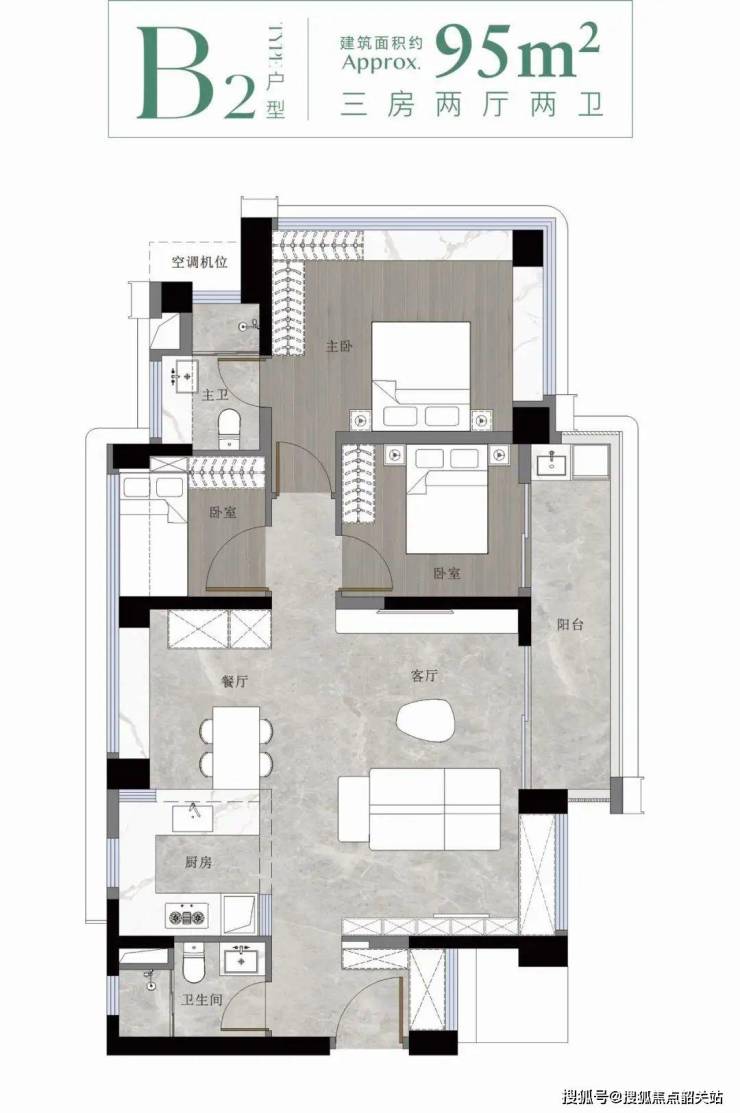 95㎡3+1房两厅两卫:四开间南向,客厅超5.55米宽,大方厅空间超44平方米,得房率破100%,适合多口之家。