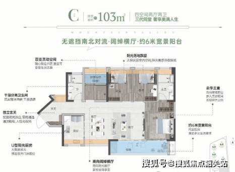 103㎡ 四房两厅两卫:南北通透,配备6米宽MAX宽景阳台,独立入户玄关设计增加私密性。
