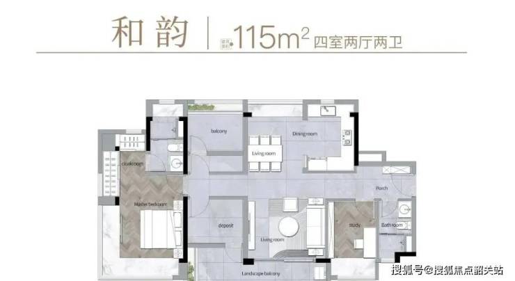 115平方米四室户型:15米朝南采光面,约7米南向阳台,主卧室全景飘窗与步入式衣帽间设计,总价适中。
