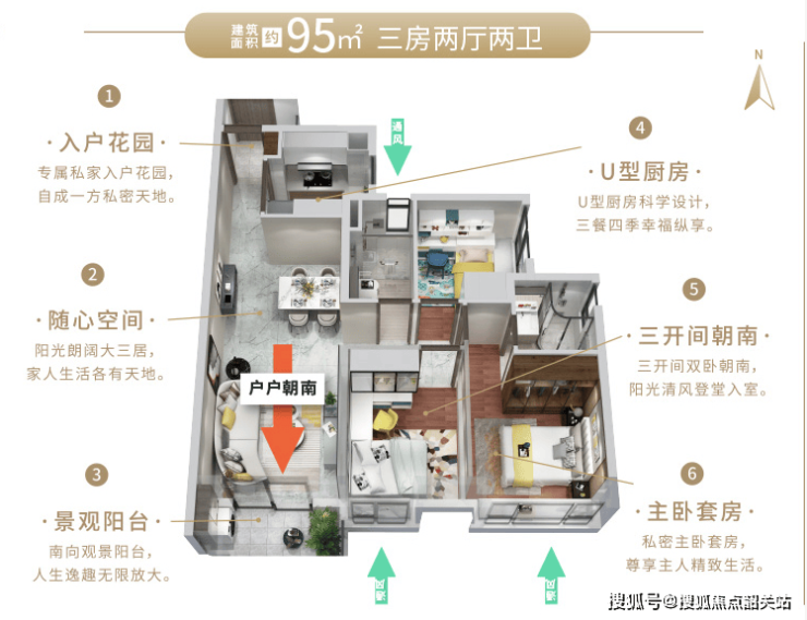 户型设计是这个项目真正让人眼前一亮的地方。建面约95平方米的三房两厅,采用全南向布局,客厅与两个卧室均朝南,厨房和次卧则朝北,形成自然对流。入户处设有一个小型玄关花园,既提升归家仪式感,也解决了鞋帽、快递等零碎物品的收纳问题。餐厨客一体化设计让公共区域显得更开阔,小家庭日常互动毫无隔阂。