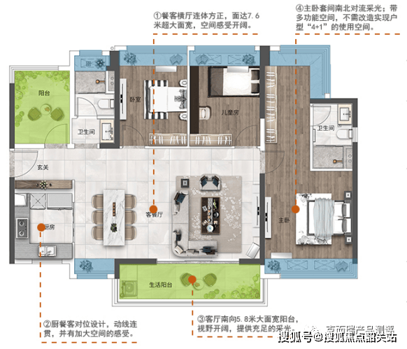 小区由13幢住宅组成,主力户型涵盖97~142㎡三房至四房,满足不同人群如二代、三代同堂家庭等多样居住改善需求。产品研发秉持“5M智慧健康”的精神内核,融入智慧家居、270度转角天幕窗户、超尺度舒适客厅、大面宽景观阳台、情景式餐厨、衣帽间等。