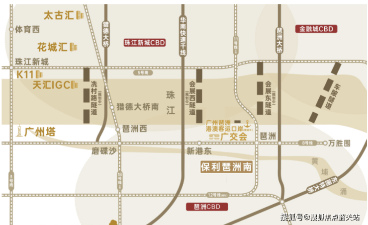 保利天奕坐落于广州城市发展主轴——琶洲人工智能与数字经济试验区的核心板块,地理位置极具战略意义。项目东接科韵路,北临黄埔涌,南靠新滘路,西接赤沙旧改片区,真正实现水系环绕的生态格局。交通方面,步行约900米即可抵达地铁8号线与11号线交汇站琶洲站,快速连接珠江新城、金融城、广州南站等多个枢纽节点。综合来看,无论是当前的商务便利性,还是未来的升值潜力,这里都占据着不可替代的战略高地。
