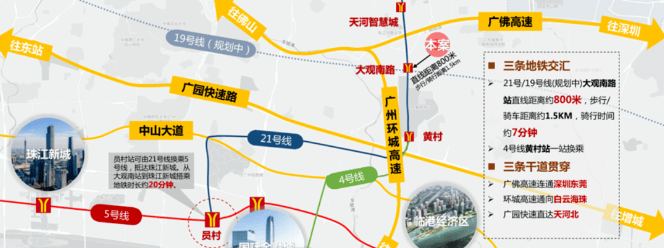 交通方面,东基·天河阳光享有三地铁环绕的优势,距离21号线大观南路站仅800米,另有4号线黄村站以及未来的19号线加持,极大提升了出行便利性。通过广园快速路、中山大道等主要道路,可迅速抵达金融城、珠江新城等地。车陂南隧道也进一步缩短了到达琶洲会展中心的时间。未来第二机场高速建成后,前往白云机场仅需30分钟,实现与东莞、深圳、广州南站等重要节点的无缝对接。