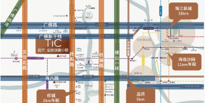 交通是衡量城市宜居性的核心指标。TIC时代全球创客小镇位于千灯湖中轴北延段,依托三横三纵主干道(广佛路、新干线、海八路、桂和路、桂澜路、文华北路)形成城市交通网络,驾车20分钟直达广州荔湾,30分钟连接佛山禅城。