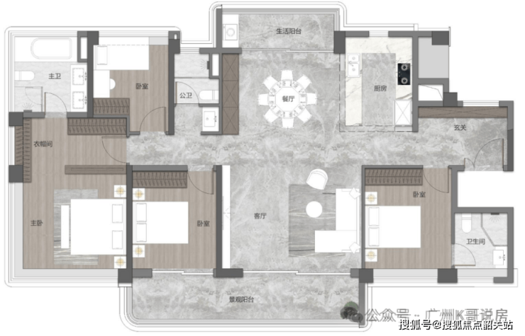 138㎡四房户型,做到了四开间朝南,约16.6米大面宽,而且餐厅带飘窗,做到了南北对流,主卧还配置了独立衣帽间和超大收纳柜,很适合二胎家庭居住。