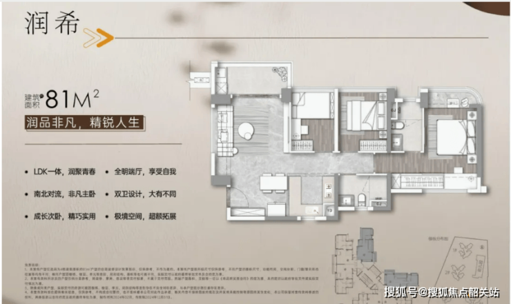 户型面积与得房率:建筑面积约81㎡,得房率约85%,实际使用面积约69㎡,两房两厅一卫设计,户型方正,三面采光,采光、通风效果极佳,适合两口之家或单身贵族居住,满足刚需居住需求。