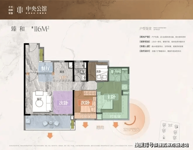 主力改善户型,采用“LDKB一体化”设计(客厅、餐厅、厨房、阳台打通),形成超4.2米面宽的社交核心区。主卧配备独立衣帽间和卫浴,私密性与舒适度兼备。参考总价约380万起,单价约3.28万/㎡,性价比突出。