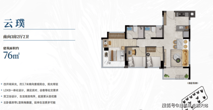 76㎡云璞户型(南向 3 房 2 厅 2 卫):四开间采光,约 3.7 米南向景观阳台,让阳光充分照入室内。LDKB 一体化设计,满足家庭聚会、会客等社交需求。双卫浴设计,提升生活效率,让起居更加从容优雅。主卧套房带有 L 型转角飘窗,拓展了生活空间。