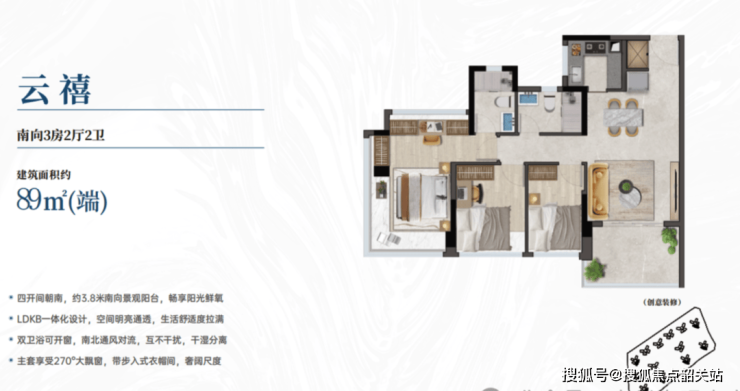 89㎡云禧户型(南向 3 房 2 厅 2 卫 - 端户):四开间朝南,约 3.8 米南向景观阳台,业主可尽情享受阳光和新鲜空气。LDKB 一体化设计,使空间更加明亮通透。双卫浴均可开窗,实现南北通风对流,且干湿分离,互不干扰。主套配备 270° 大飘窗和步入式衣帽间,空间奢阔。
