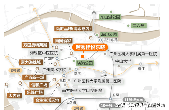 项目地处海珠成熟老城区腹地,步行约600米即达地铁8号线晓港站(约8分钟),同时临近2号线市二宫站与规划中的10号线滨江东站,形成三地铁环绕格局。通过8号线可快速换乘至昌岗、客村、琶洲等枢纽;自驾方面,依托东晓路、昌岗路、江南大道等主干道,配合海印桥、广州大道南,实现“0红绿灯”快速通达越秀、天河,约20分钟抵达珠江新城或琶洲会展核心区。项目虽处老城,却兼具高效通勤与生活烟火气,是典型“老城芯+快连CBD”的黄金区位组合。