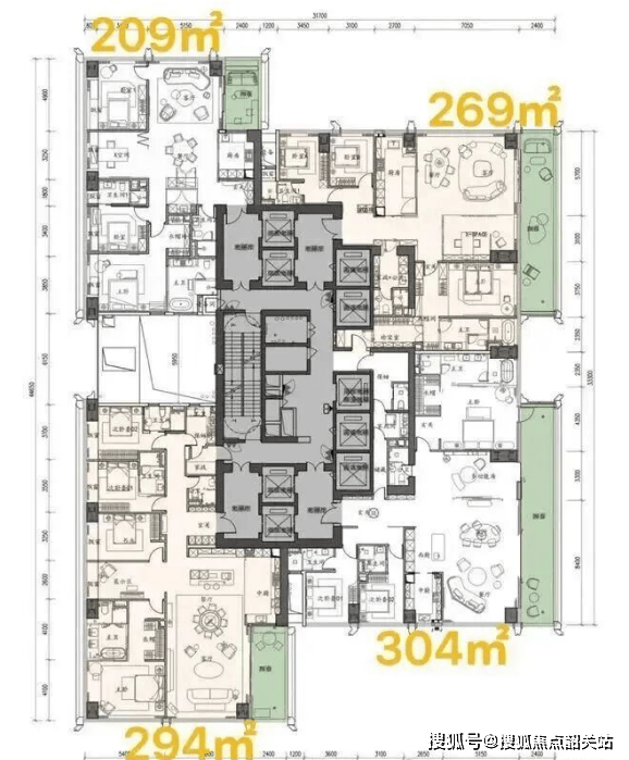 在后海沄玺花园的产品设计上,开发商摒弃了传统的紧凑布局,转而专注于打造极致的超高层大平层产品,主力户型面积跨度从209平方米至1050平方米,充分满足了不同层次高端家庭的居住需求。项目采用了新规下的创新设计,得房率超过92%,这在超高层住宅中极为罕见,意味着业主能够享受到更为宽敞实用的室内空间。所有户型统一层高达到3.6米,营造出开阔通透的视觉感受,彻底消除了压抑感。针对中低区(5-39层)的房源,面积约在209至304平方米之间,设计为四房三卫并附带家政间。虽然该区域东面存在写字楼遮挡,但其独特的梯户比设计弥补了景观上的些许不足。每层配置5梯4户,实际呈现为2梯2户的双开门格局,确保了每户人家都拥有独立的专梯入户空间,私密性极佳。户型设计上,209平方米户型拥有约8.8米进深、5.15米开间的阔绰客厅;而304平方米户型则配备了约15米开间的超大阳台,尽显大气。高区(41-51/56层)及超高区(58-62层)的房源,面积从370平方米延伸至700平方米,全部朝向东方,享有无遮挡的海景视野。这些户型采用5梯3户设计,同样实现专梯入户。其中,403平方米户型设计了4+1房五卫,客厅开间达6.5米;700平方米的大平层更是拥有约13.5米进深、11米开间的巨型客厅,以及约15.5米开间的观景阳台,配备5房(4套房),将奢华居住体验推向顶峰。顶楼更设有1050平方米的定制大平层,非传统复式结构,而是通过定制化设计,为顶层住户打造独一无二的空中宫殿。每个户型均提供两个设计方案可选,并支持多种装修风格及家具电器选配,真正实现了“千人千面”的个性化奢居梦想。
