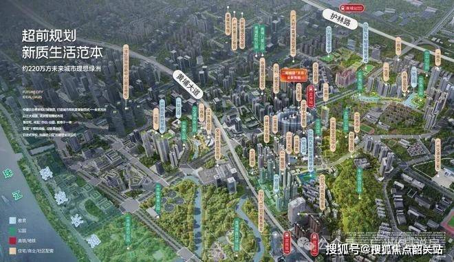 城市景观资源是未来方洲的重要生活价值维度。项目周边分布多座城市山体公园与滨水休闲空间。包括文园山公园、龙头山森林公园、黄埔荔枝公园以及滨江生态景观带。城市绿地系统为居民提供休闲运动与亲子活动场景。社区内部还规划大型中央景观花园与架空层社交空间。社区内部通过7.9米架空层空间构建邻里活动中心,设置健身、儿童娱乐以及老年活动功能区域。