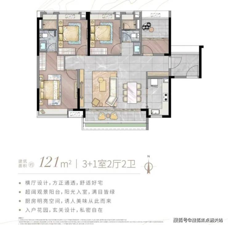 约101㎡三房两厅两卫:入户花园设计实用,横厅设计增加空间通透感,南向大主套舒适度高。