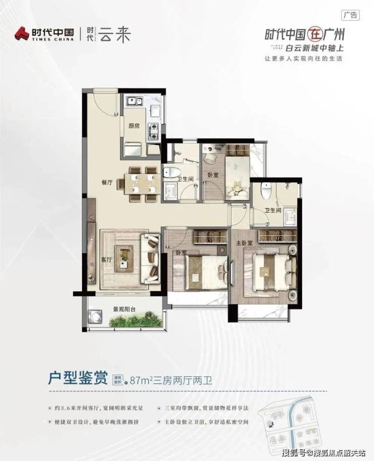 约87㎡三房两厅一卫:创新型入户花园设计,满足杂物收纳需求;约3.6米开间客厅,采光充足;主卧带观景飘窗,可欣赏园林美景。