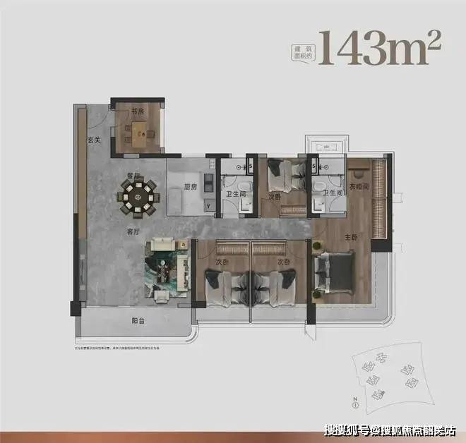 143㎡户型:南向宽景4开间设计 | 约36.5M环幕采光面 | 270°环幕瞰景主卧|多元化功能阳台