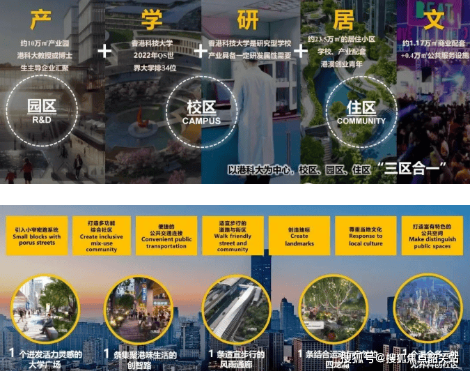 项目自身配备有约1.17万㎡活力商业街区,并计划引进越秀服务生态文创店、港科大的实验店等业态,营造集聚港味生活的创智路。同时,超级空中连廊的设计不仅连接了产学研居四大板块,也便捷地链接了东涌地铁站、港科大及项目本身,形成了一个无边界的“环港科大”生活圈。