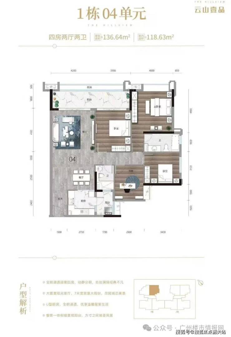 项目主推现楼改善大宅,主力户型为136㎡、165㎡阔绰四房,少量115㎡舒适三房。户型均采用方正格局设计,南北通透、多开间朝南,采光面充足。客餐厅一体化设计延伸空间感,宽景阳台尽揽白云山景与社区园景。主卧配套独立卫浴与衣帽间,奢适感拉满。四房户型空间宽敞,可满足三代同堂或多孩家庭居住需求,功能齐全、尺度阔绰,是改善家庭一步到位的理想选择。