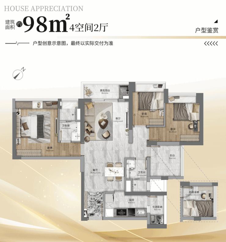 **置业跃级**:同等价格下,项目以三房预算实现四房配置,减少未来20年置换成本。例如98㎡四房总价低于区域同面积三房产品,兼顾功能性与性价比,契合家庭成长周期需求。