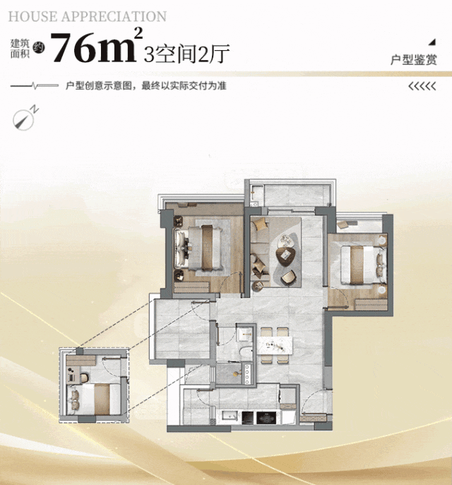 **76㎡三房两厅一卫**:白鹅潭唯一在售小面积三房,三开间朝南,LDK一体化设计扩大公共空间,主卧带飘窗,次卧可容纳1.5米床与衣柜,适合预算有限但追求功能性的首改家庭。