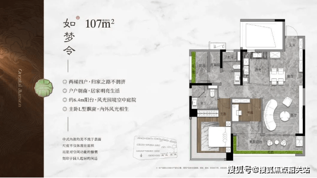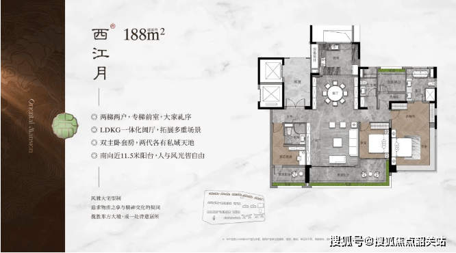 从主力结构来看,107平方米更多承担的是“首套改善”与“刚换改善”的角色,四开间朝南、宽面宽客餐厅、LDK一体化布局成为核心卖点;143—188平方米则属于标准改善型家庭产品,强调公区尺度、动静分区、主卧套房化设计;268平方米则是纯粹为高净值家庭定制的顶级产品,梯户比极低,强调私密入户、双阳台、超大尺度主卧及景观视野。