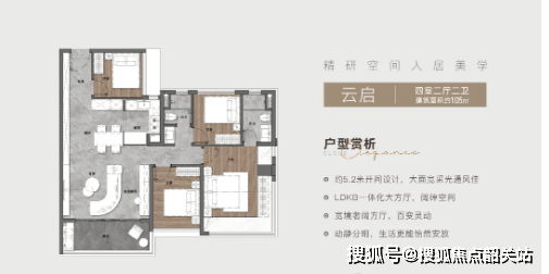建面约 105㎡四房两厅两卫:采用竖厅设计,动静分区明确,南向阳台延伸空间视野,额外拓展的灵动空间可作为书房或儿童房,适配成长型家庭。