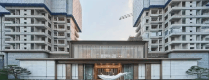 建筑规划上,整个项目容积率仅2.07,限高60米,由9栋住宅组成(含3栋17层板楼和6栋23层塔楼)。外立面采用岭南新中式风格,没有浮夸的装饰,但门楼、窗格、吊灯等细节融入了“余荫山房”的园林意象。比如主入口“山河如意门”宽超70米,结合书卷造型与山水视野;下沉庭院以《万壑松风图》为蓝本,叠石流水营造出可游可憩的立体园林。这种克制又有文化底色的设计,在当下新盘里不多见。