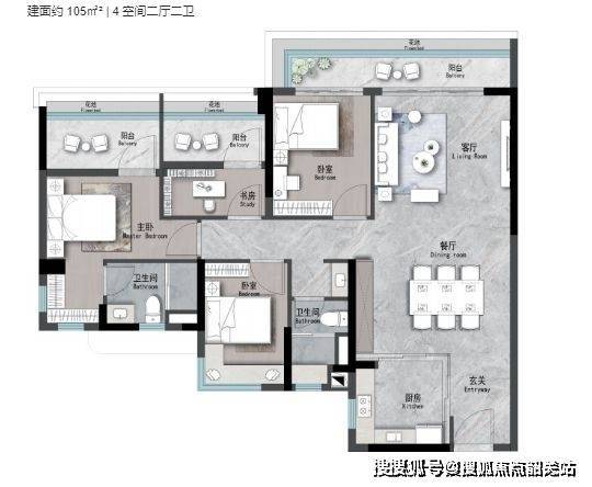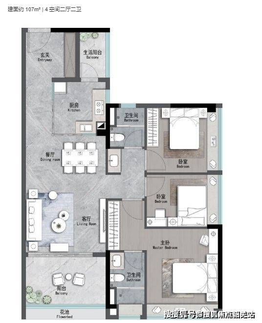 107㎡四房两卫:南北通透,双阳台,总价约690万元;