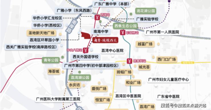 越秀珑悦西关的核心价值在于小户型高使用率、老西关核心板块地段及交通便利性。项目距离地铁5号线+13号线二期西场站仅约900米,5号线+11号线中山八站约1公里,交通便捷,双地铁换乘含金量高。周边教育资源丰富,项目自配24班小学,毗邻华侨小学及环翠园小学,教育保障到位。