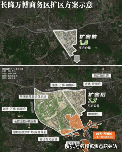 项目坐落于成熟度拉满的长隆万博超级CBD核心腹地,板块发展起点优越,依托城市南拓战略规划,完成量级跨越式升级。原有万博商务区占地面积1.5平方公里,经官方扩容规划落地后,板块全域拓展至7.2平方公里,纳入长隆度假区、里仁洞更新片区,整体规划规模超越珠江新城,进阶为广州重点打造的世界级地标商圈。