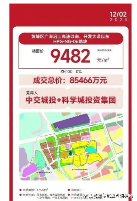 中交科城·黄埔未来城由世界500强央企中交集团旗下的中交城投与黄埔本土国企科学城集团联合开发。中交集团总资产近2.6万亿元,承建港珠澳大桥、深中通道等国家级工程,资金实力与交付保障能力远超普通房企;科学城集团作为黄埔开发区最早成立的国有企业,在产城融合、片区开发方面经验丰富。项目地块于2024年12月以底价8.5亿元竞得,剔除回迁及配建后,实际楼面价仅约9482元/㎡,为打造高性价比改善产品奠定成本基础。作为黄埔首个第四代住宅项目,其背后是“央企+地方国企”双轮驱动的城市更新范本。
