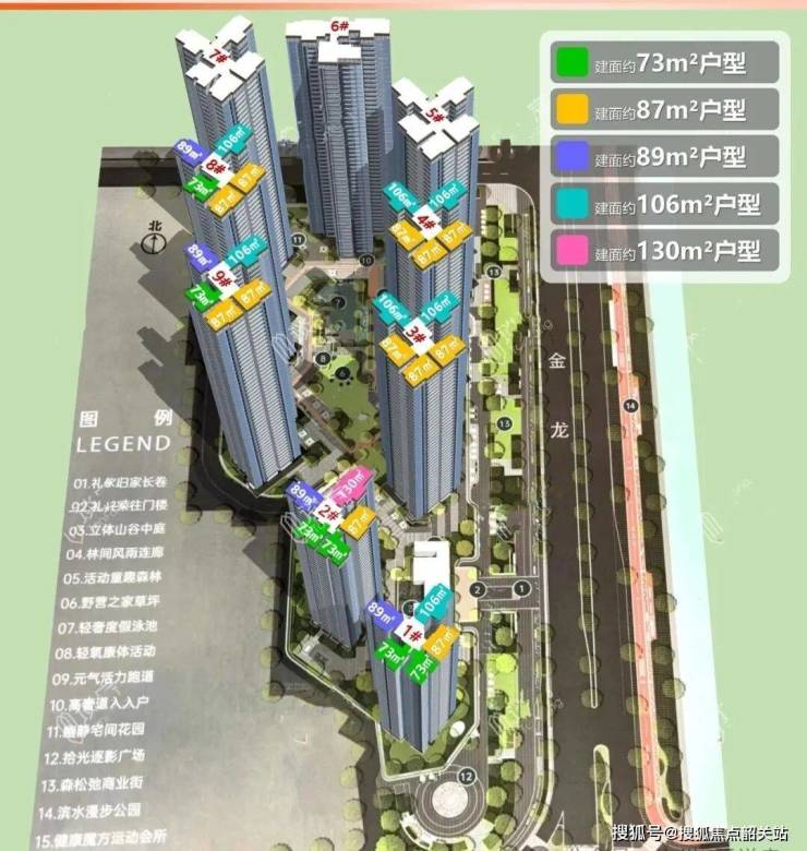 楼栋规划:一期共 6 栋住宅,首开 1 栋、2 栋(32 层,两梯五户);3 栋、4 栋(42 层,三梯五户);8 栋、9 栋(47 层,三梯五户)