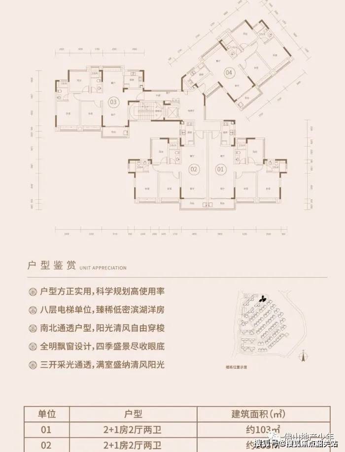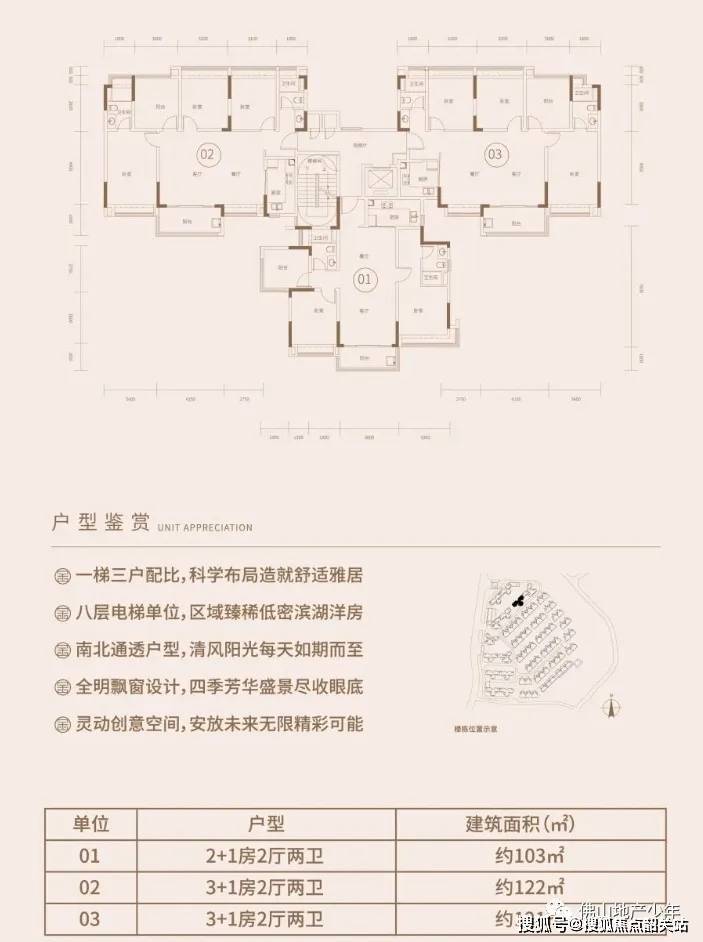 目前在售洋房户型,南向瞰湖洋房,建面约103至122平三至四房。